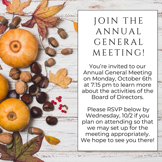 First, please consider coming to our Annual General Meeting on Monday, October 6th. This adults only meeting is a great way to be introduced to the work the Board of Directors does for the school as well as mingle with the Board, staff, and room parents.